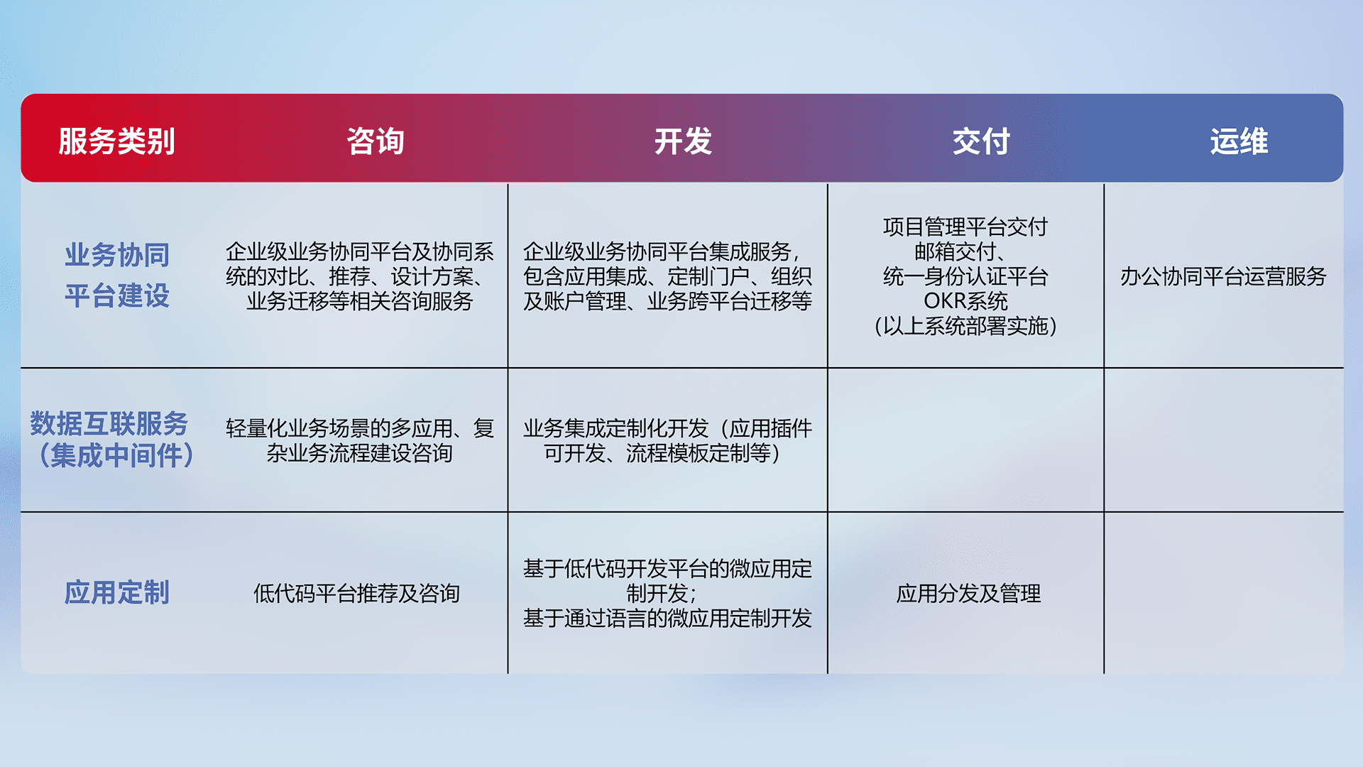 针对钉钉、、、、企微、、、IDaas等平台级产品提供产品的规划、、、、方案、、、、交付、、、定制化开发等服务,,,,实现如统一协同办公、、、、智能客户服务、、、混合会议管理、、、智能数据查询、、、等业务场景,,,,实现数字化转型。。。。