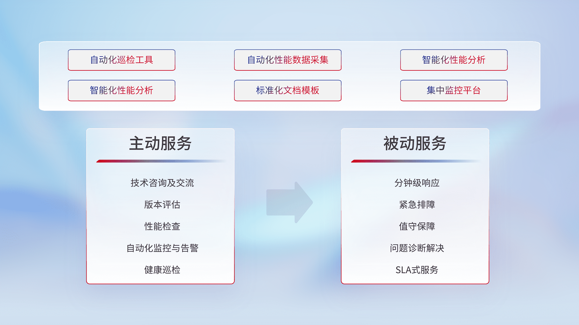 智能化工具和标准化文档,,保障服务质量,,,提供主动服务(包含技术咨询、、版本评估、、性能检查、、、、自动化监控与告警、、、健康巡检)和被动服务包含(分钟级响应、、紧急排障、、、、值守保障、、、问题诊断解决、、、SLA服务)。。。。